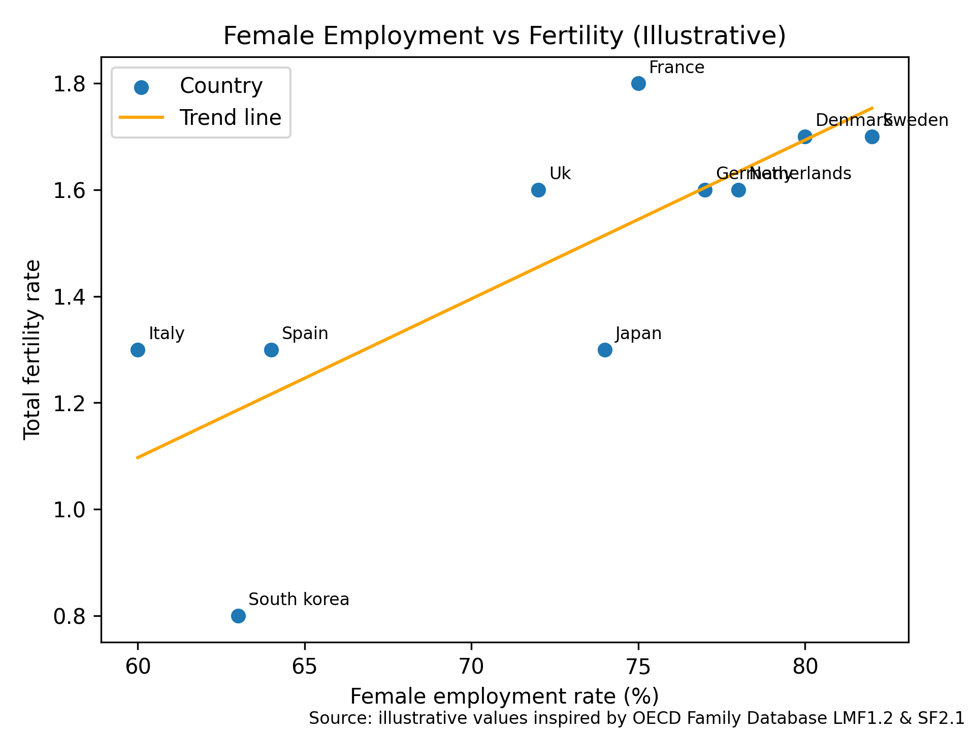Correlation analysis between female employment rates and fertility.