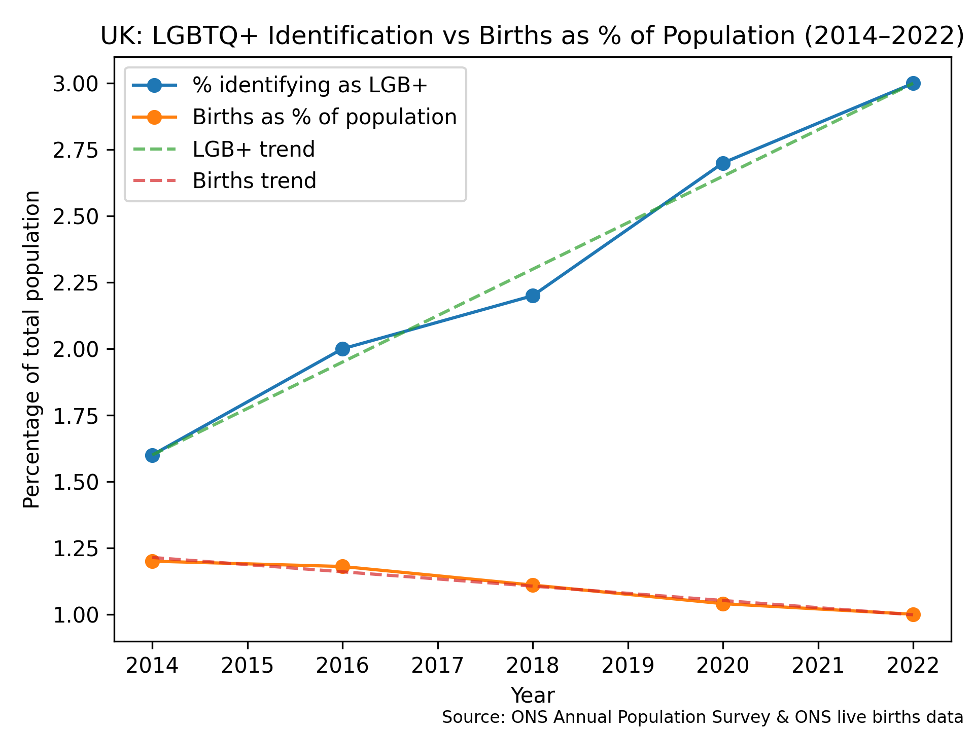 Relationship between LGBTQ+ population identification and birth rates.